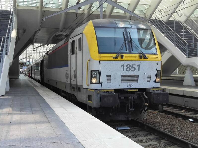 De HLE 1851 staat met een sleep I11-rijtuigen in Liège-Guillemins (Luik-Guillemins) onderweg als IC-trein van Eupen naar Oostende.