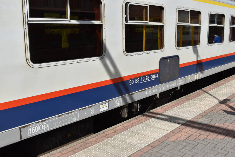 Rijtuig 50 18 19-78 034-9 staat in een IC-trein naar Bruxelles-Midi te wachten op vertrek in Liège-Guillemins.