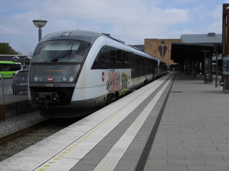 De 4928 staat samen met de 4925 in Odense, te wachten op vertrek als RE 4645 naar Svendborg. Het voorste treinstel was van de nodige hoeveelheid graffiti voorzien.