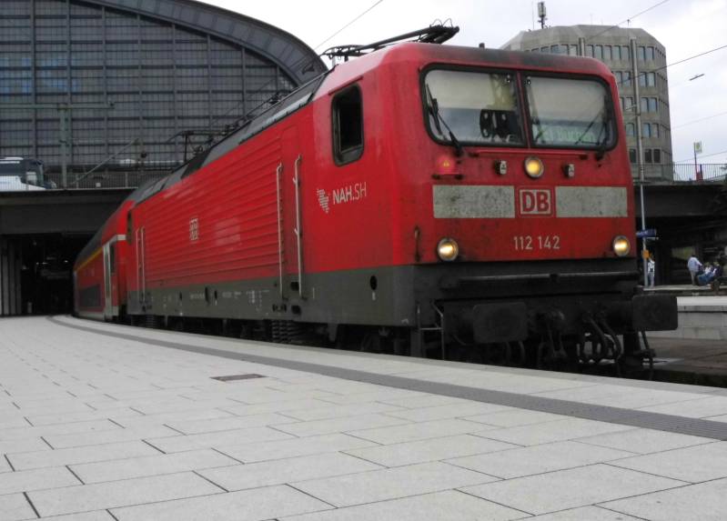 De 112 142 voor het regionale verkeer in Sleeswijk-Holstein, staat met een sleepje Dosto's in Hamburg Hbf, als RE 1 naar Büchen.