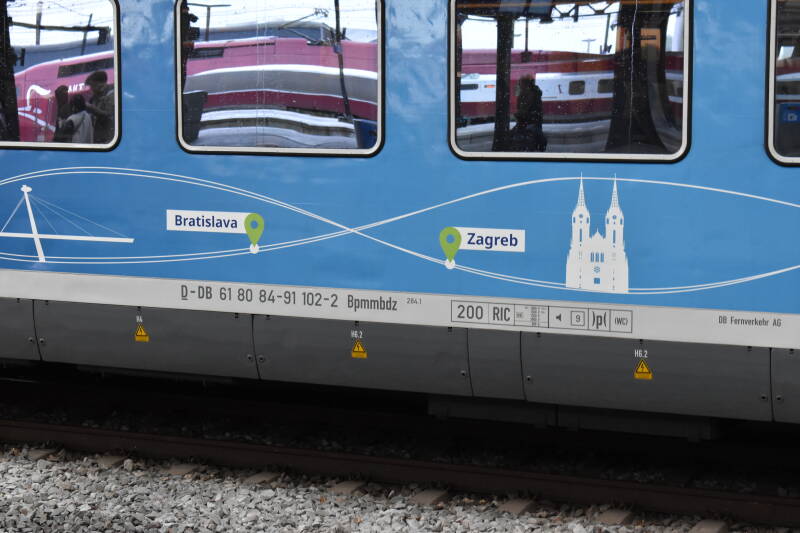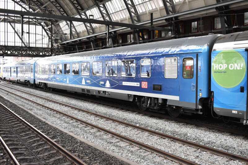 Voor de Connecting Europe Express is rijtuig 61 80 84-91 102-2 in een speciale kleurstelling gestoken. Hier staat het rijtuig in Amsterdam Centraal.
