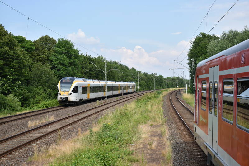 Terwijl een BR 420 vertrekt als S68 naar Wuppertal-Vohwinkel, komt de ET 7.01 (429 006) door Hochdahl-Millrath gereden onderweg als RE 13 naar Venlo.