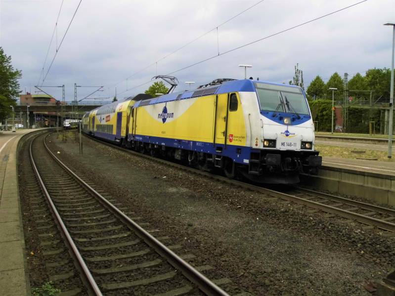 Locomotief 146-11 vertrekt met een sleepje Dosto's van Hamburg-Harburg onderweg als RE 3 naar Hannover Hbf.