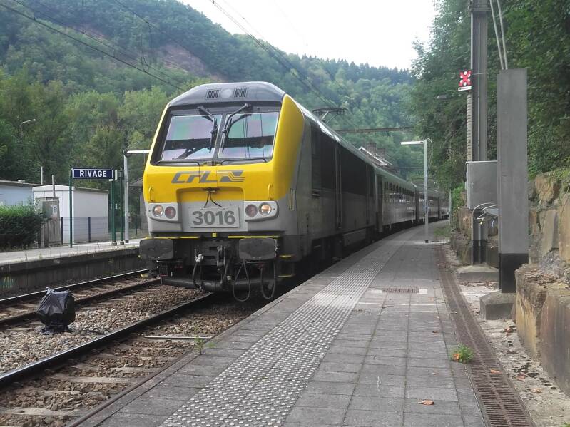De 3016 staat met NMBS I10 rijtuigen in Rivage, onderweg als IC-trein naar Ettelbruck. Normaliter zou deze trein nog verder rijden naar het Luxemburgse hoofdstation, maar dat was door werkzaamheden niet mogelijk. Tegenwoordig rijden op deze verbinding desiro's.
