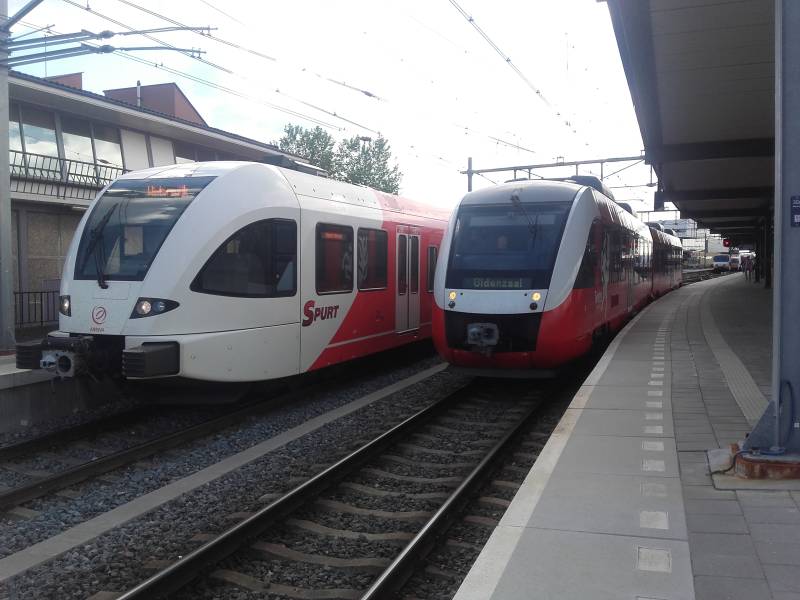 Syntus Twents Lint'41 38 staat in Zutphen te wachten op vertrek als stoptrein naar Oldenzaal. Links naast dit treinstel staat Arriva GTW 374 als stoptrein naar Winterswijk.