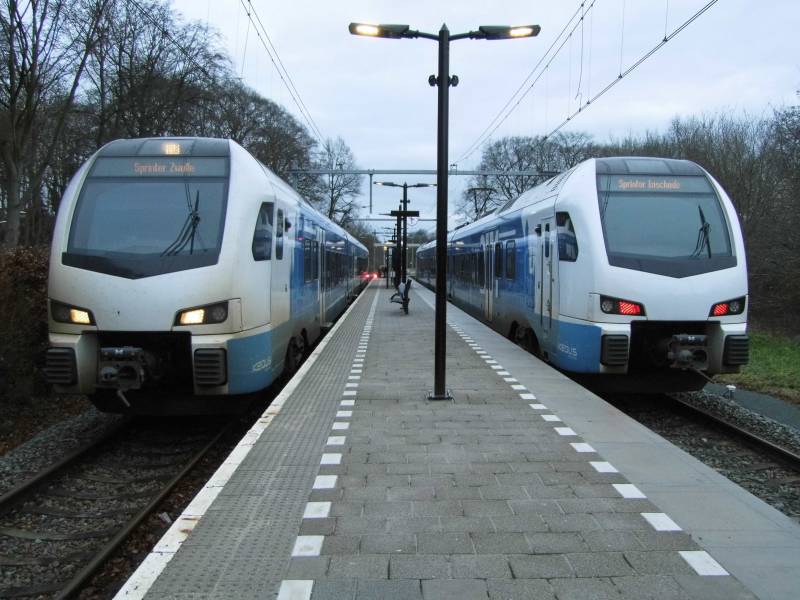 De sprinter naar Zwolle kruist met de sprinter naar Enschede op station Heino.