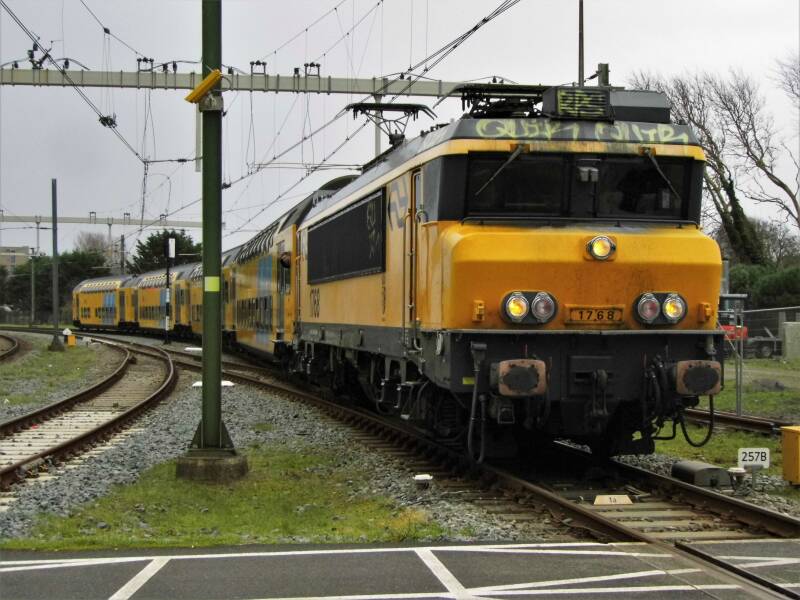 Locomotief 1768 met het wapen van het Friese Akkrum arriveert met DDM-1 7208 in Zandvoort aan Zee. Deze trein reed zijn afscheidsrit op deze dag. De 1768 is tegenwoordig onderdeel van de collectie van het spoorwegmuseum.