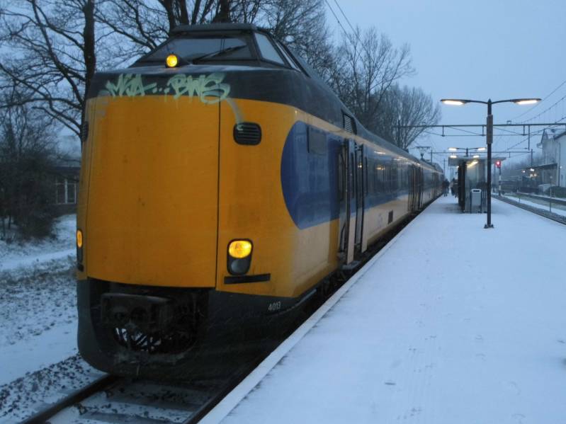 ICMm 4013 staat in de sneeuw in Wolvega, onderweg als sprinter naar Leeuwarden.